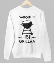 Valkoinen unisex collegepaita "Varoitus! Isi grillaa"