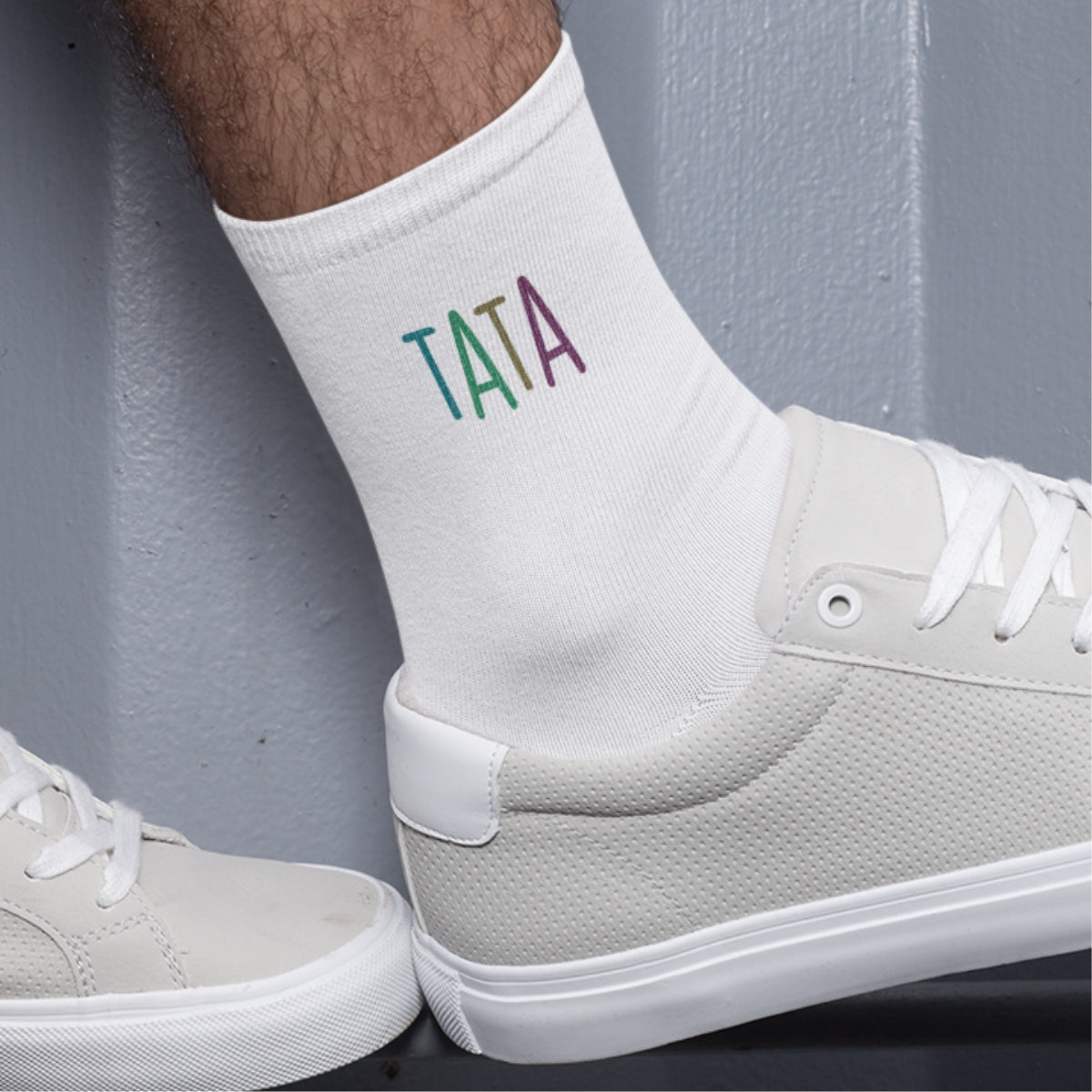 Białe skarpetki z napisami Tata z kolorami. Zapakowane w stylowe brązowe pudełko.
